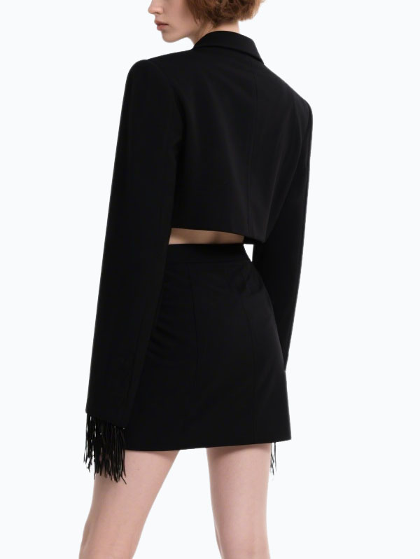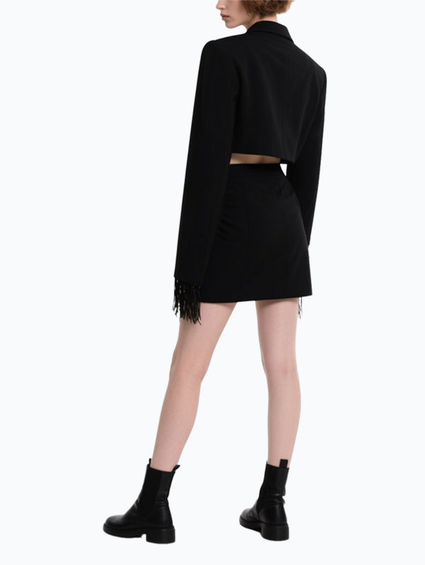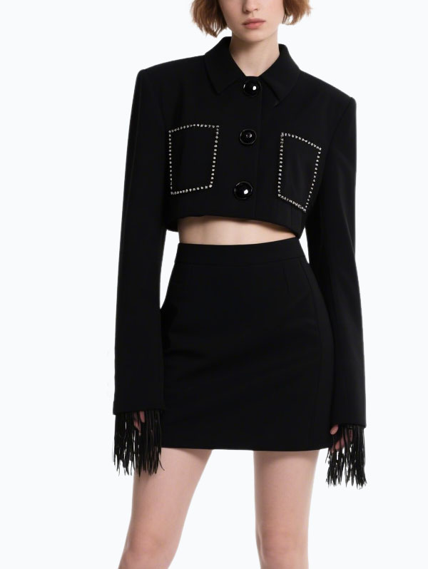 Black Crop Jacket Set with Studded Pockets & Fringe Cropped, Mini Skirt