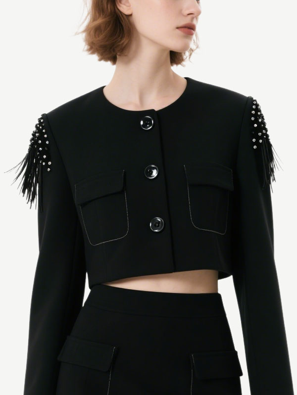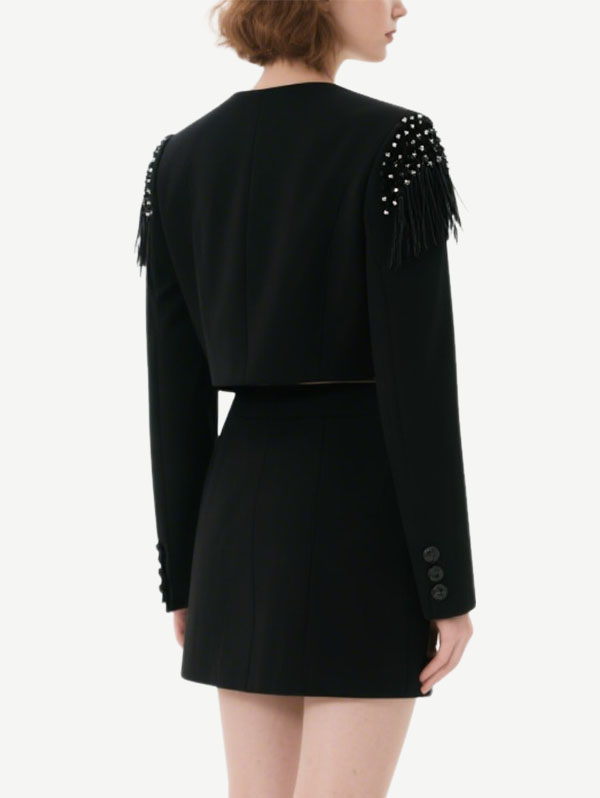 Be the first to review “Edgy Black Crop Suit Studded Fringe Shoulders, Mini Skirt”