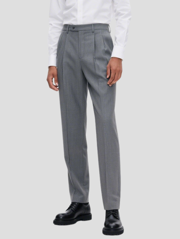 Grey Textured Pleated Men’s Suit Pants Classic Office Wear