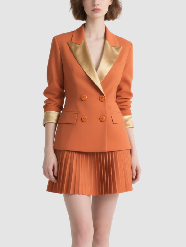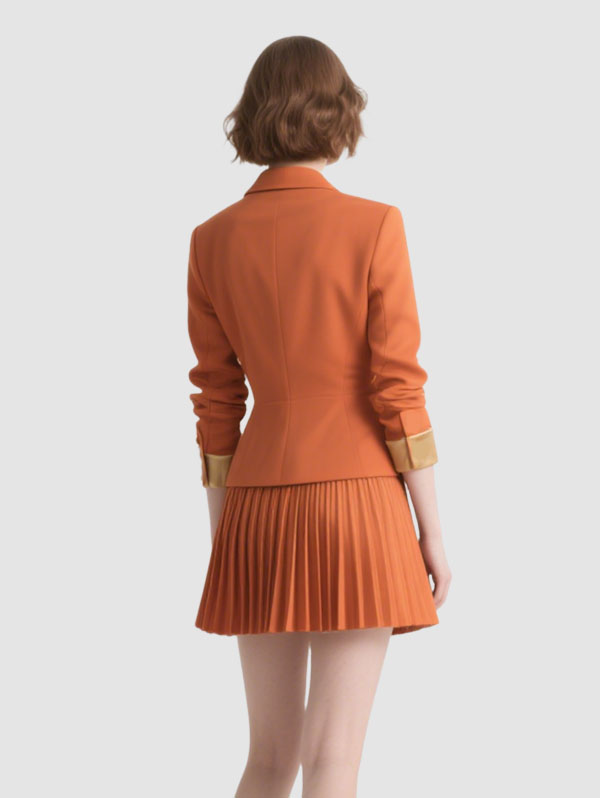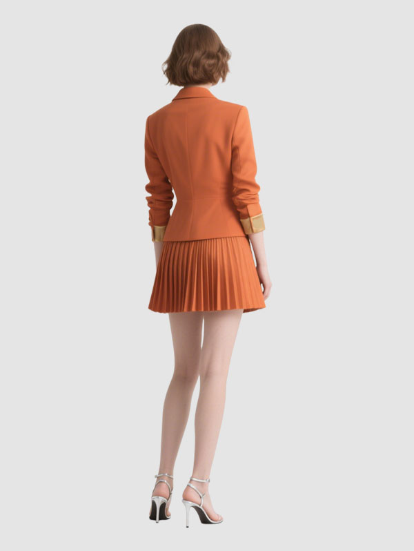 Orange Double Breasted Blazer Set with Gold Lapel Pleated Skirt