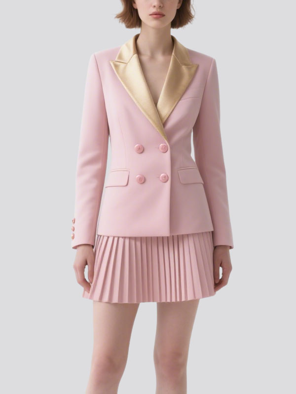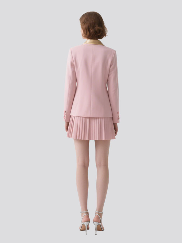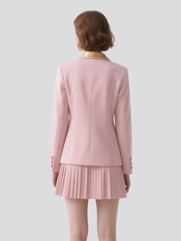 Pink Blazer Set with Gold Lapel Double Breasted, Pleated Skirt