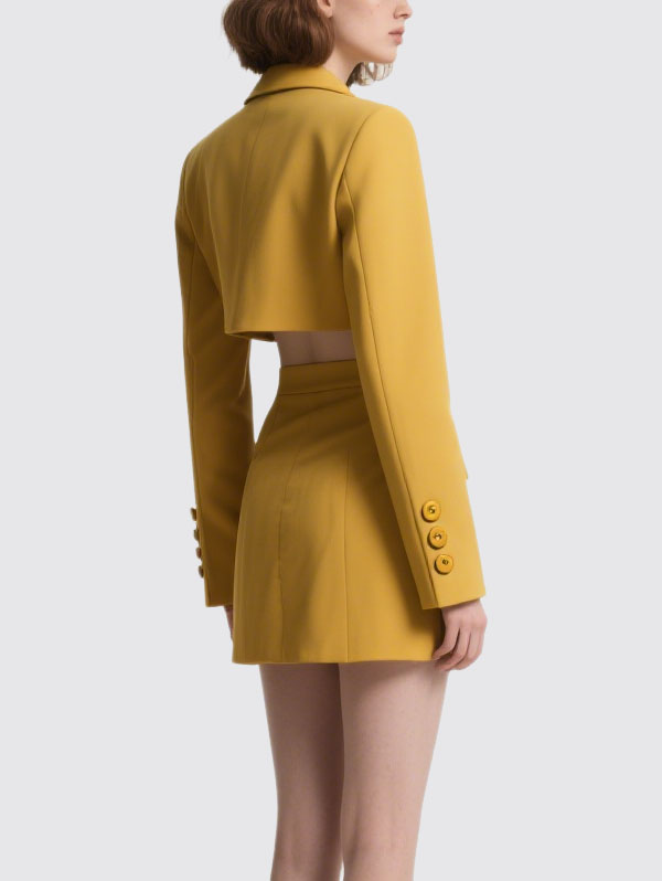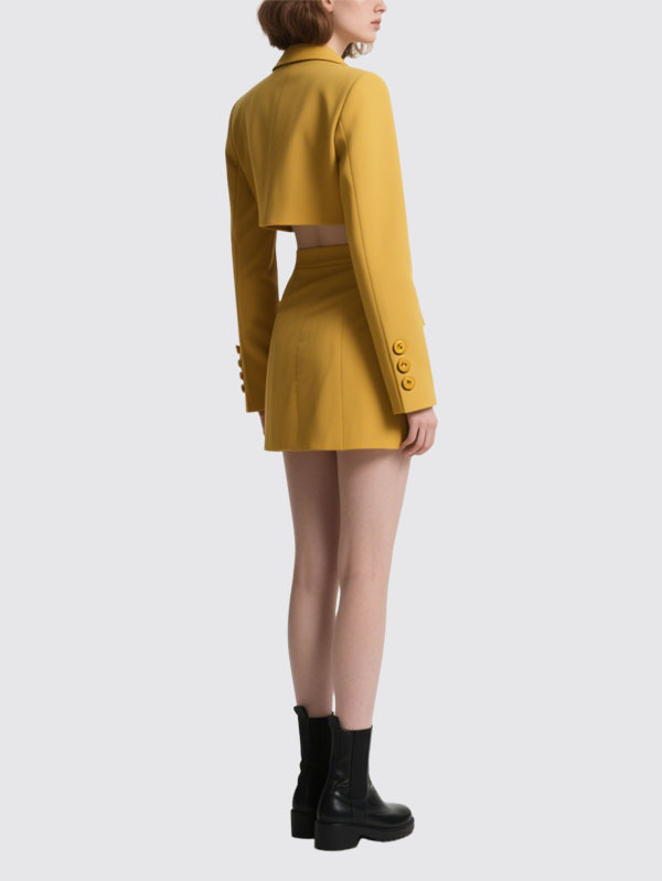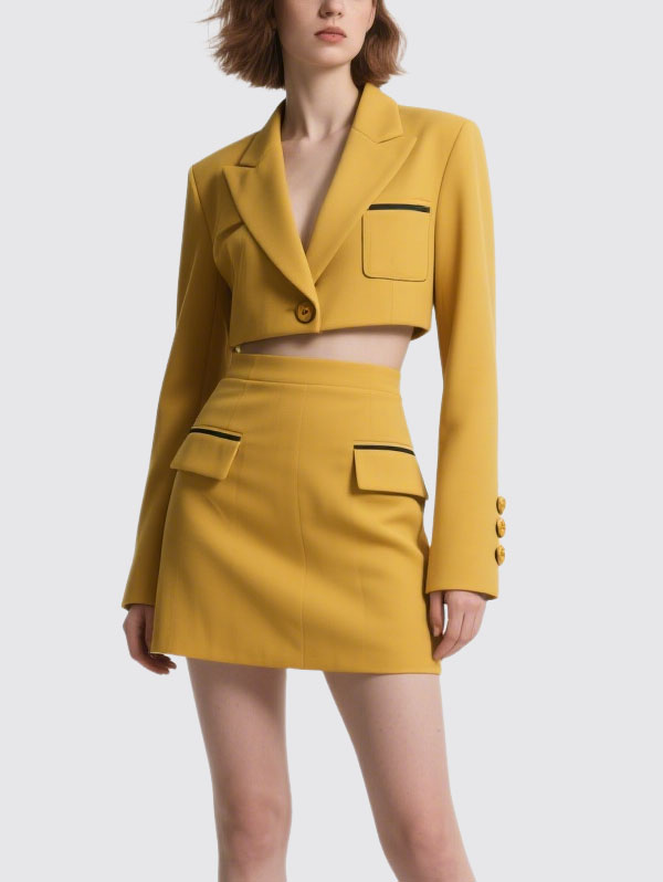 Yellow Crop Blazer Set with Black Piping Pocket Accent, Mini Skirt