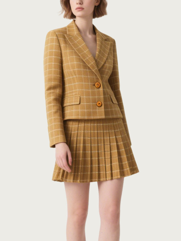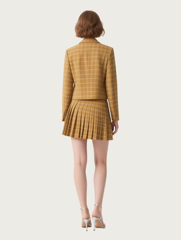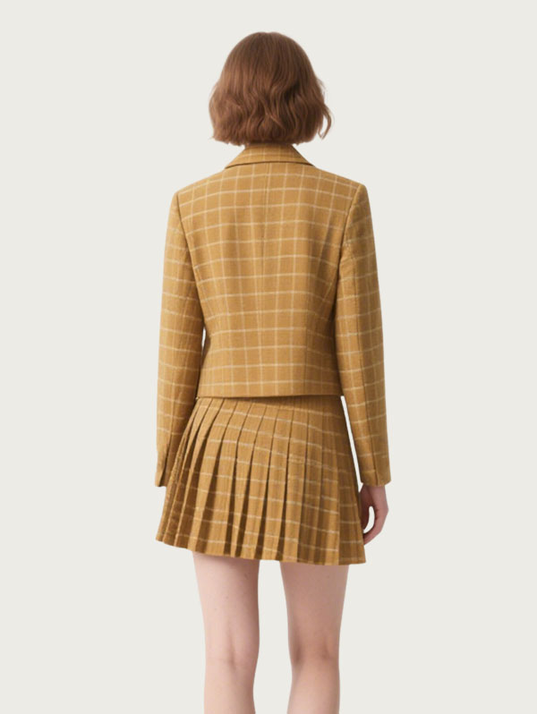 Yellow Plaid Blazer Set Double Breasted, Pleated Skirt